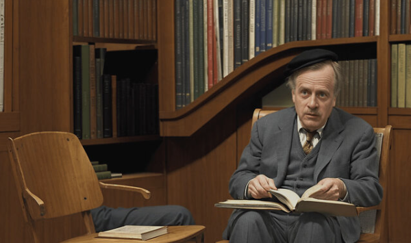The shadow is cast by the shelf above his head. It is long and narrow, and therefore so is the shelf.
