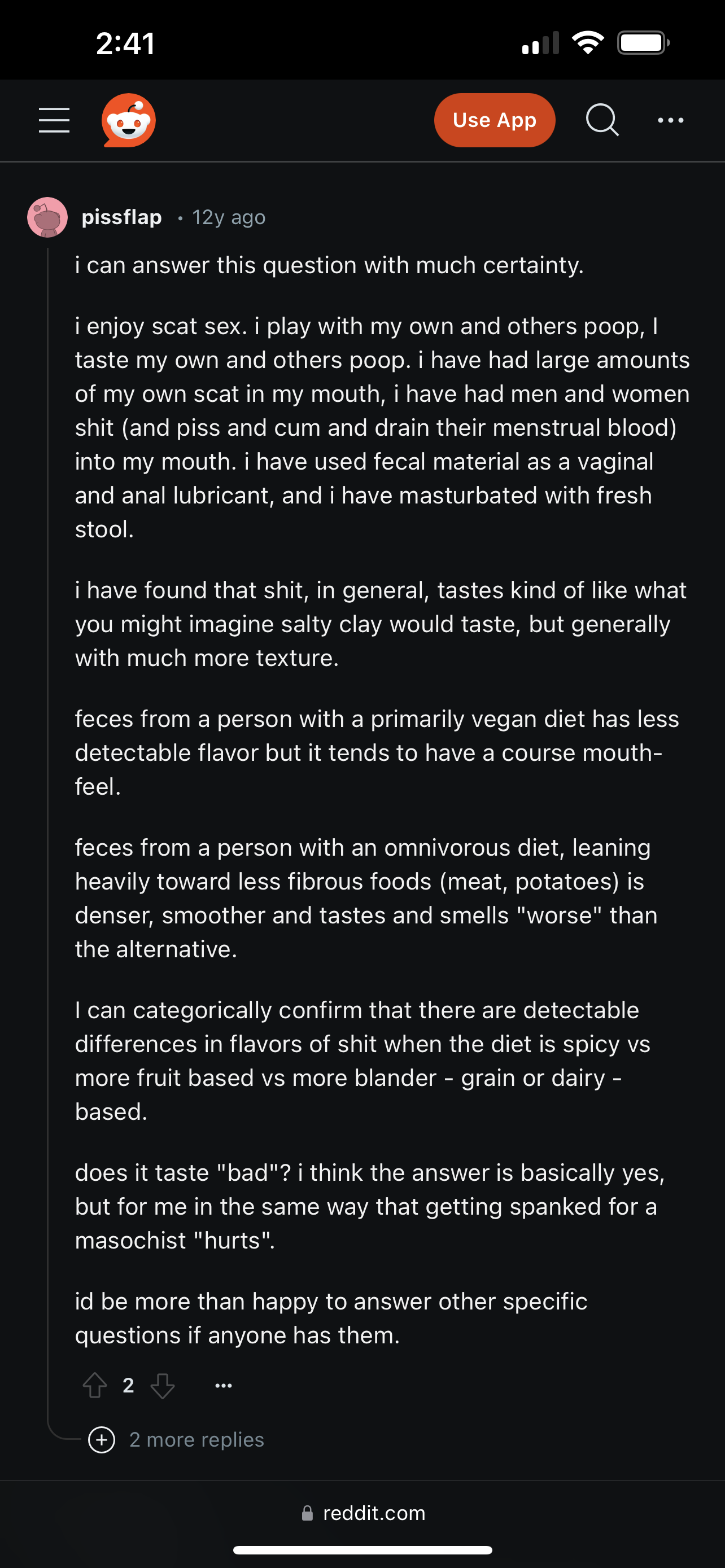 Anonymous D joined in and replied with this 1 year ago , 8 hours later, 1 year after the original post[^] [v] #1,302,179 Nature has a way of filtering the poop eaters out of the gene pool. Unless everyone has lied to me my entire life and I can stop washing after using the shitter.