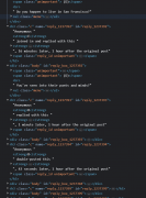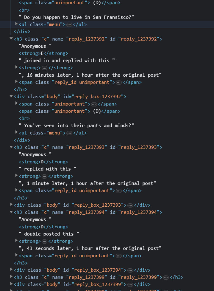 idk how to code, so i don't know what the actual problem was, but i couldn't get beautiful soup to scrape content, i forgot the effing thing it said, but it needed uhhh, a css tag of some kind i think to know which elements to pull from. i looked, it needed a class and i couldn't get it to work with class "c" or see <strong>A</strong> as a name field, and the name="reply_783782479" and id being based on what and if it was a reply to, and the actual comments are i guess inheriting attributes since they are just kinda chilling there like they don't need give a fuck.