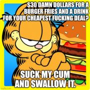 Anonymous A started this discussion 2 years ago #111,711 $30 damn dollars for a burger fries and a drink for your cheapest fucking deal?