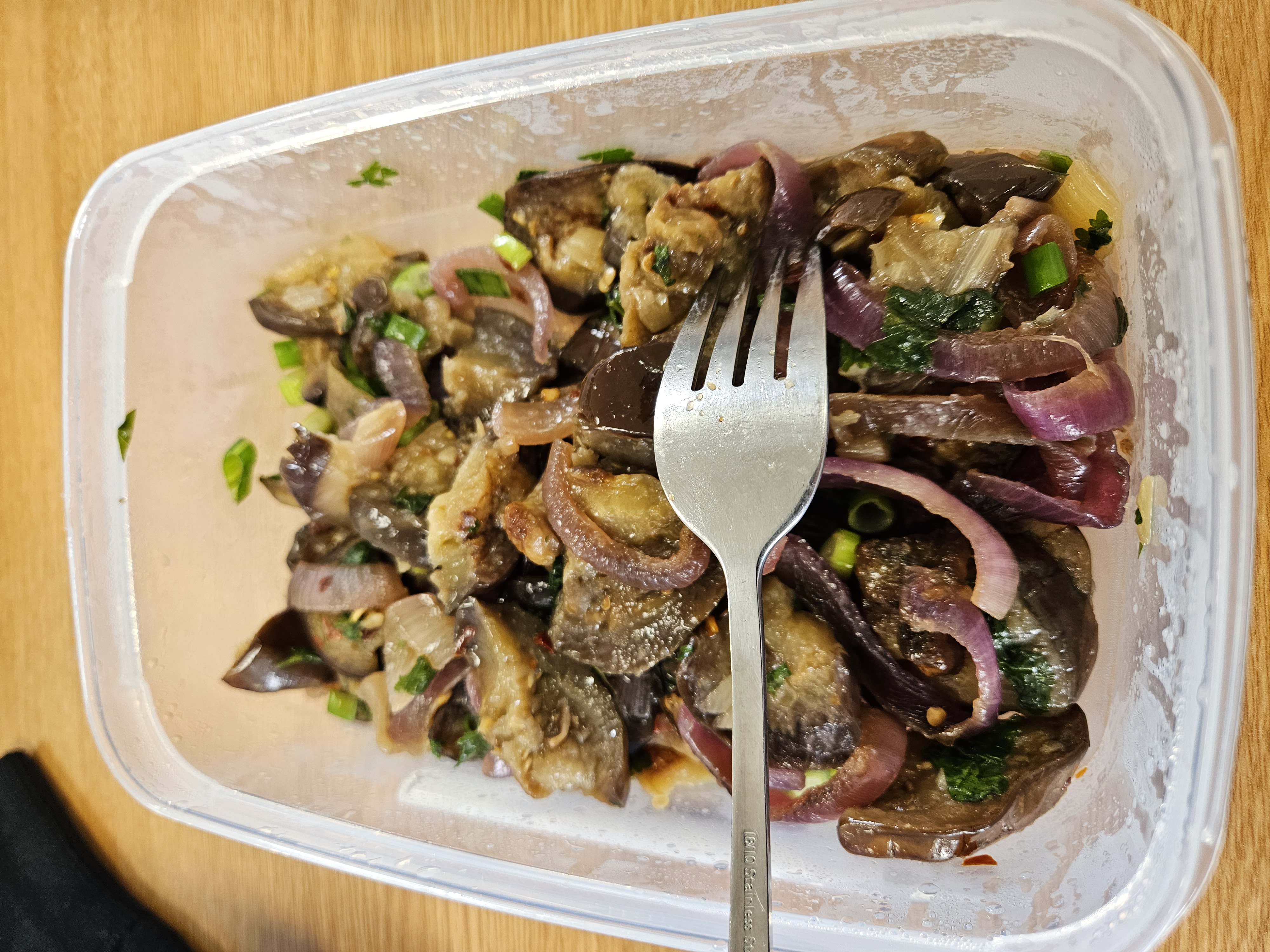 > Aubergine, red onion, coriander and chilli flakes cooked in soy source