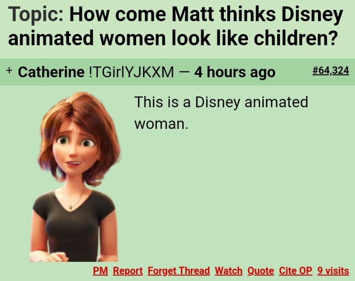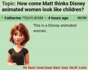 Concerning the Disney women looking like children. This relates to a cartoon phenomenon of later versions of long-running characters having softer and more infantile features than their previous versions. Sometimes I'll look at an earlier version and even get a sense that I am seeing something uglier that what I am used to. Anyhow, in the picture, features to notice are the disproportionately large head, and the large eyes. Sometimes cartoonists take it too far for my taste and I hate their stupid big heads and eyes.