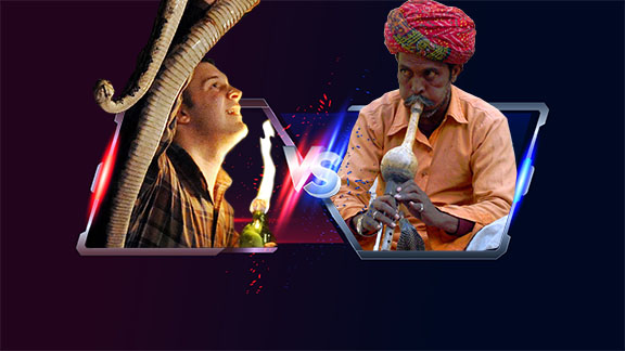 > A charming snake handler using a kazoo so he can have his hands free for the snake
