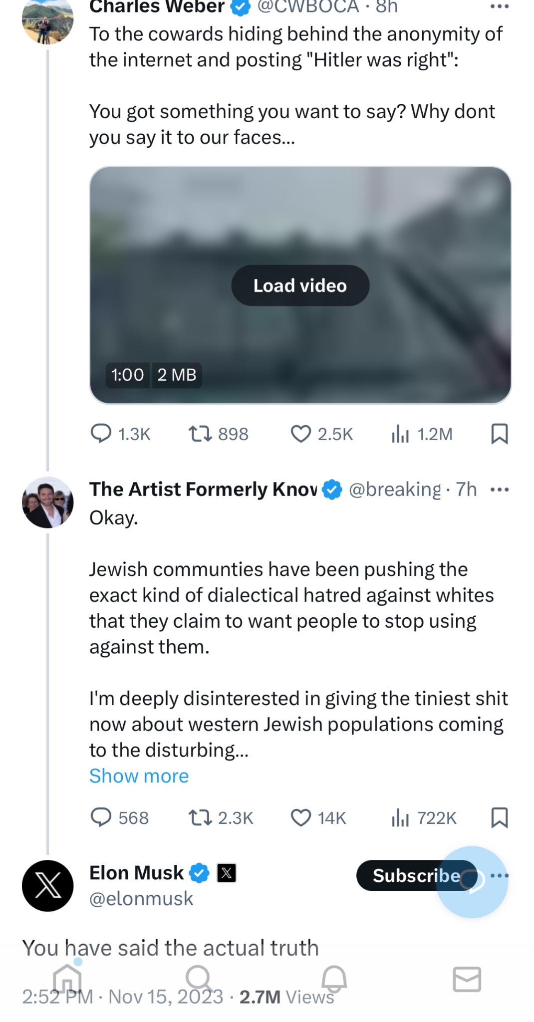 Are you asking me to tell you why it's antisemitic if Elon agrees with someone who thinks "Hitler was right" and that Jews are engaged in stirring up race hatred against white people and consequently deserve antisemitism from "hordes of minorities"? I will just ignore your spirited comments about Jews controlling the media and pulling Disney ads out of politeness...but I mean c'mon this is a layup.