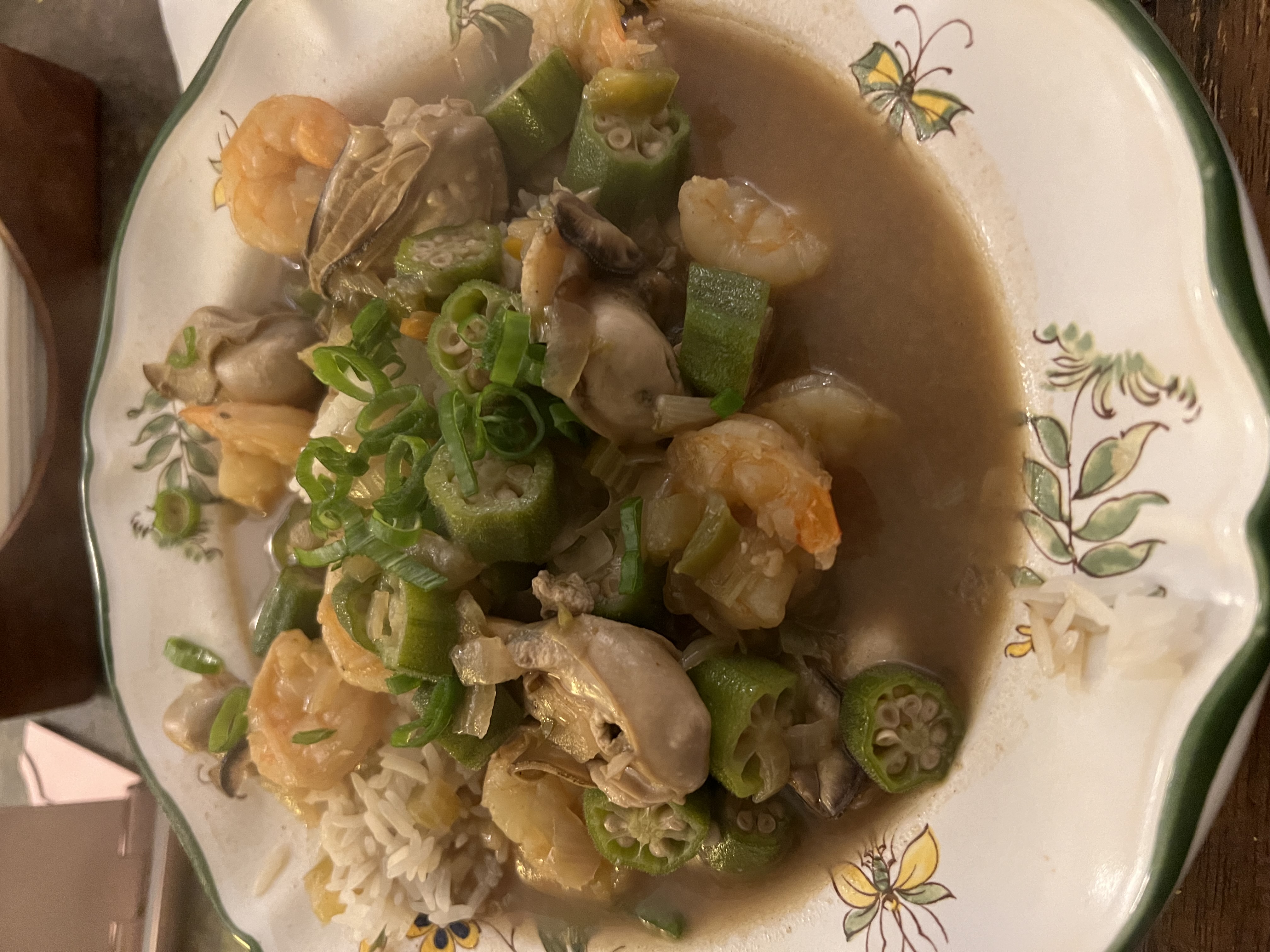 Besides the roux and the holy trinity, it's a shrimp, oyster, and okra gumbo.