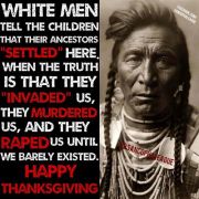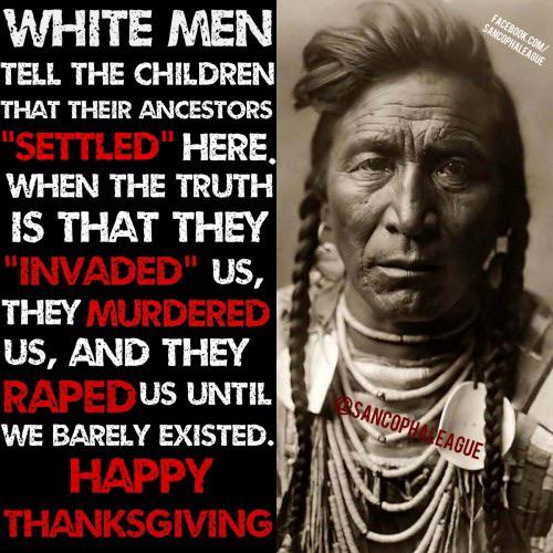 Thanksgiving Day will always be a day of genocide. As you're sitting there with your family, remember the families of all the dead Indians, who lost everything because of YOU.