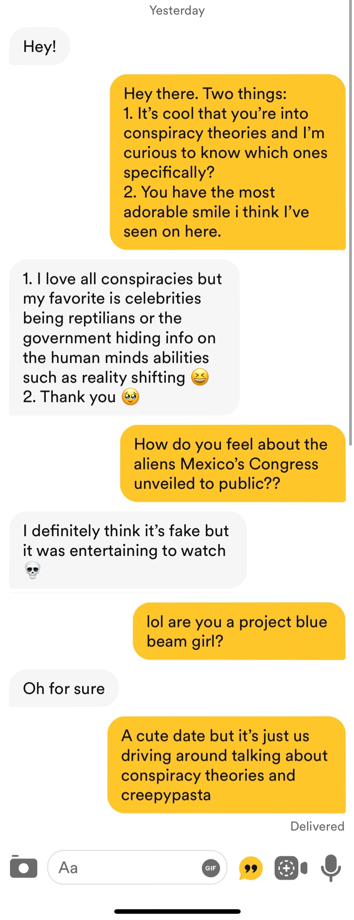Also those are some pretty shit conspiracy theories. There are some interesting and somewhat compelling ones out there, but somehow she's into some of the most implausible and ridiculous. Hopefully at least somewhat ironically. I wouldn't say it's a red flag, but it does sound like a pink flag. But, hey, whatever.