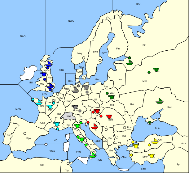 Diplomacy is a strategic board game created by Allan B. Calhamer in 1954 and released commercially in the United States in 1959.[1] Its main distinctions from most board wargames are its negotiation phases (players spend much of their time forming and betraying alliances with other players and forming beneficial strategies)[2] and the absence of dice and other game elements that produce random effects. Following each round of player negotiations, each player can issue attack and support orders, which are then executed during the movement phase.