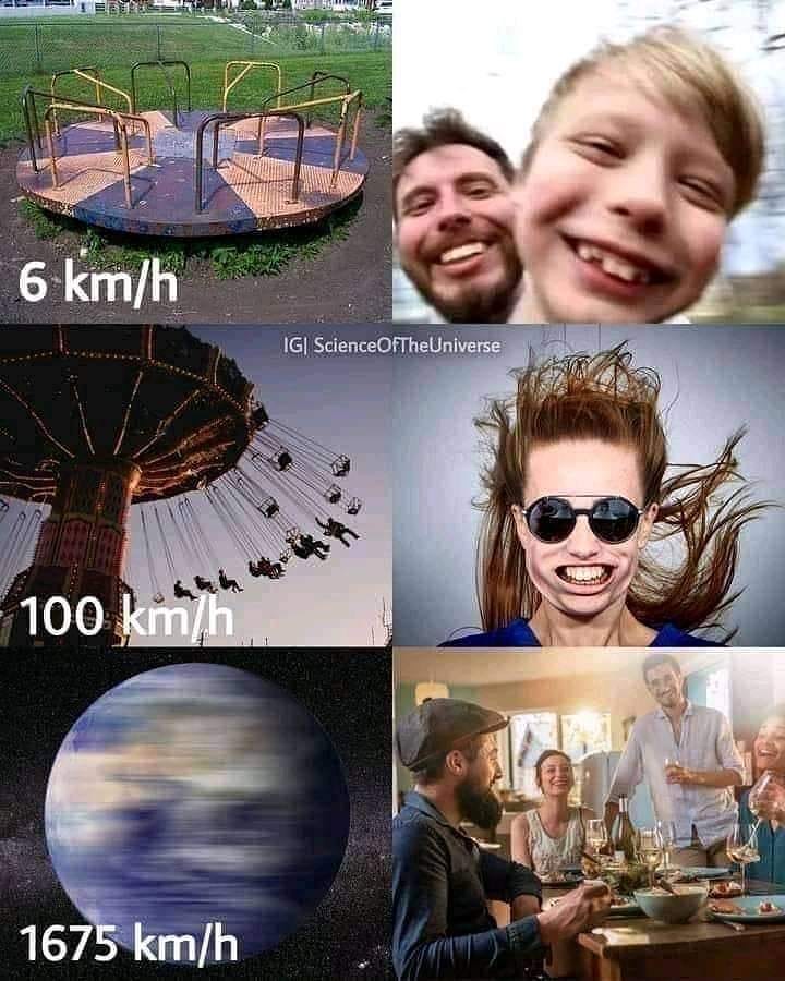 @1,273,964 (B) > Listen, my friend, let me break it down for you. The reason we don't fly off the spinning earth is because it moves smoothly and gravity keeps everything in place. Just like when you're cruising in a car at 60 miles per hour, you don't feel the movement. Same thing here.