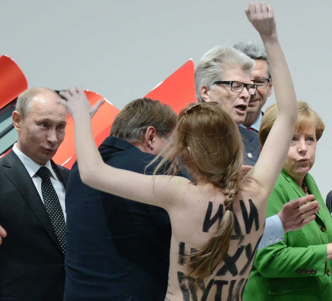 Maybe another protester had his todger out and Merkel preferred to look at that. The writing on the girl's back is literally telling Putin to jump on a dick.