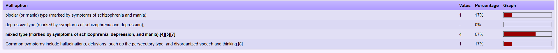 The results are in: you have mixed type schizoaffective disorder marked by symptoms of schizophrenia, depression, and mania.
