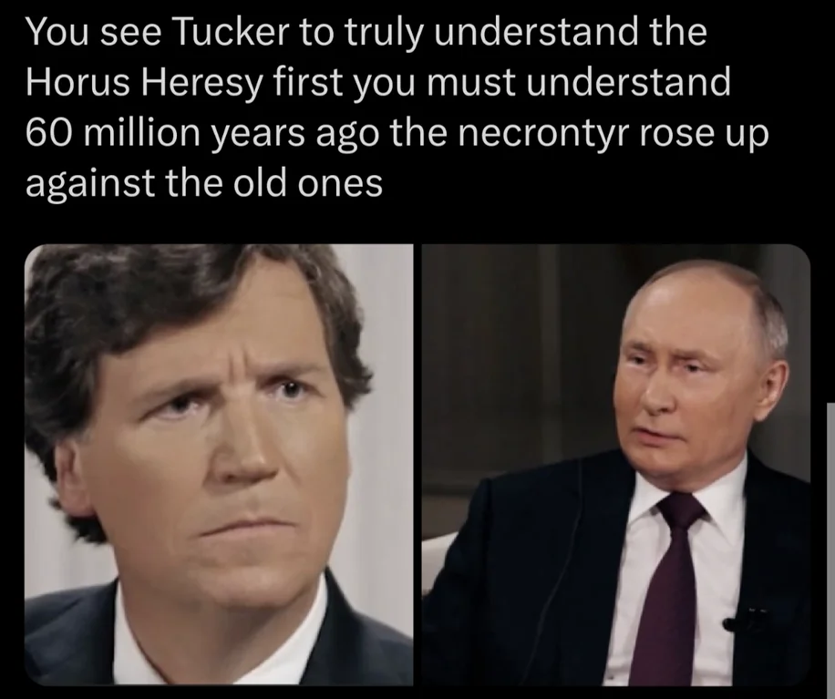 Ok I am finally listening, and if you can ignore the incredible suffering this man is responsible for, the interview is hilarious. Tucker prefaces the interview by saying he initially just didn't believe Putin was being sincere when he launched into a 30 minute diatribe about the history of Ukraine and Russia, but has no other explanation other than Putin was being entirely sincere. Tuck starts the interview off by saying Putin launched the invasion because he was worried about the West and Putin disagrees and starts his "30 second to 1 minute" explanation of how Ukraine and Russia began to exist. I'm many minutes into the explanation and we Putin's going like decade by decade starting in the year 940 AD or whatever. Tucker doesn't know what he's getting himself into and it's grate.