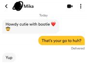 We matched once before and she opened with the same line about my booty. I can't remember how that match ended, but it didn't go very far. I recognized her from the last time and lo and behold, she sends the same sexual harassment line.