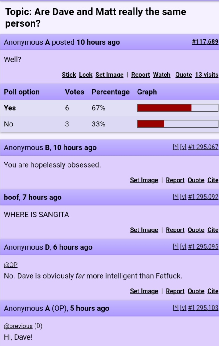 Anonymous A (OP) replied with this 1 year ago , 52 minutes later, 4 hours after the original post[^] [v] #1,295,103 Father Dave !RsSxeehGwc joined in and replied with this 1 year ago , 5 hours later, 10 hours after the original post[^] [v] #1,295,125 Anonymous B replied with this 1 year ago , 27 minutes later, 11 hours after the original post[^] [v] #1,295,130 I'm surprised butthurt Dave hasn't locked this thread yet.