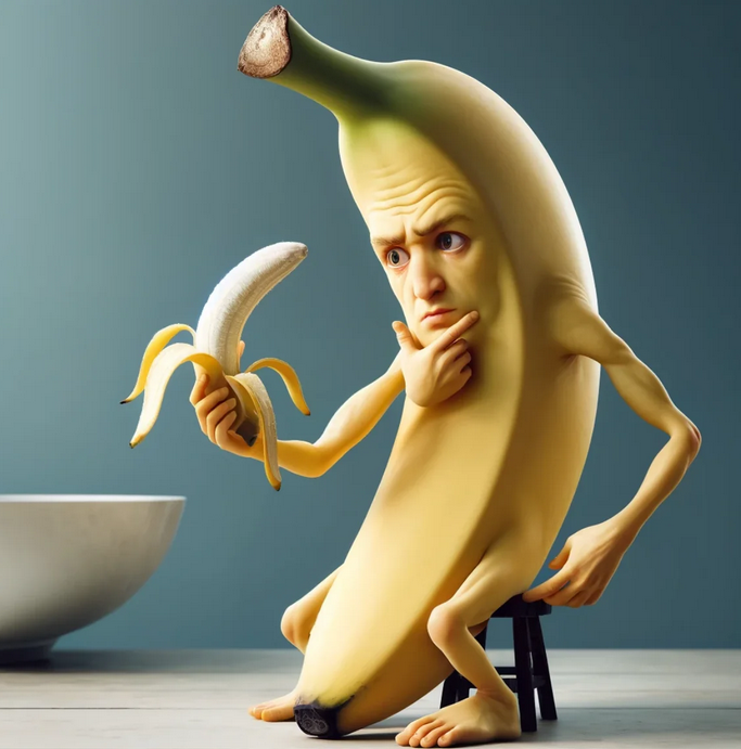 He's holding a whole banana, and it doesn't have a face or limbs.