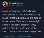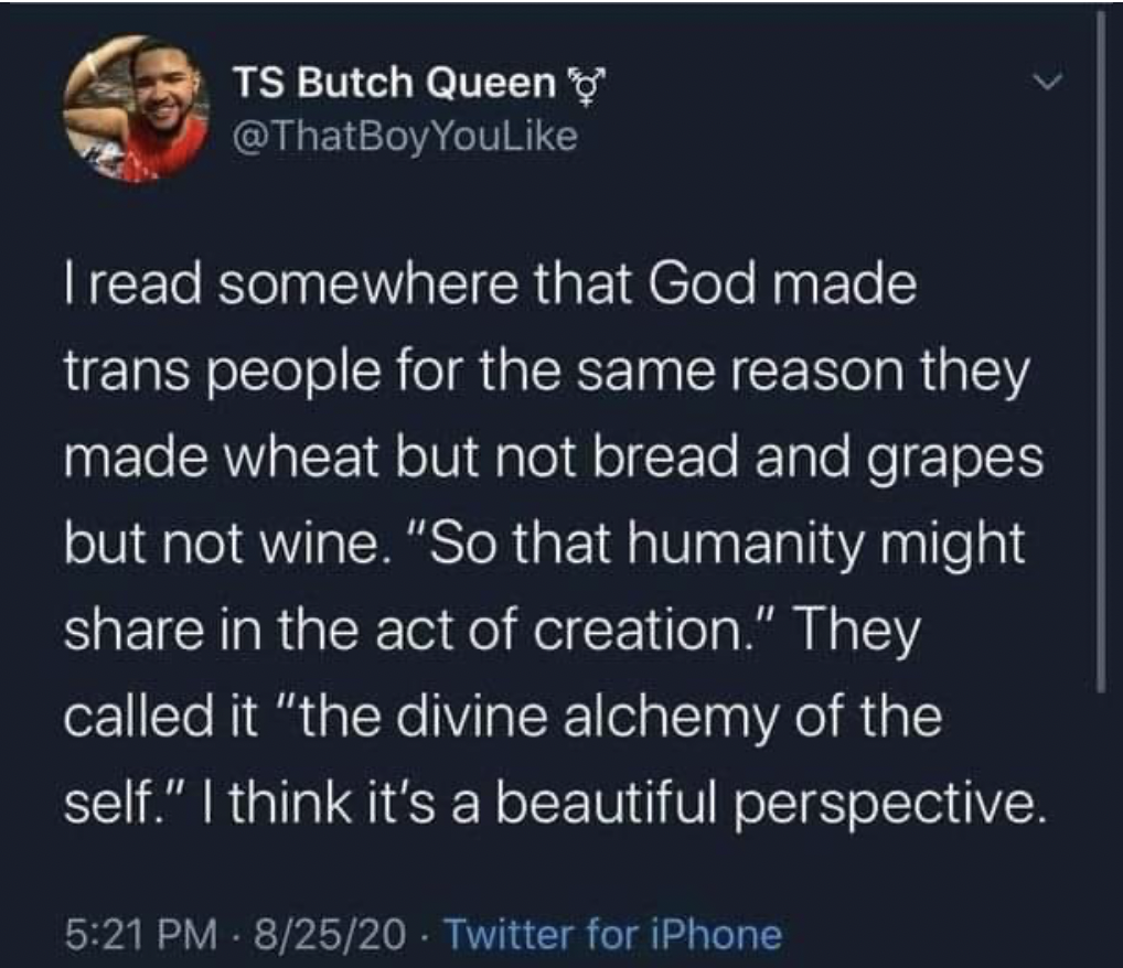 Anonymous E joined in and replied with this 1 year ago , 14 minutes later, 1 hour after the original post[^] [v] #1,300,523 Trans people must be religious because "being born in the wrong body" implies a soul to be born into a body.