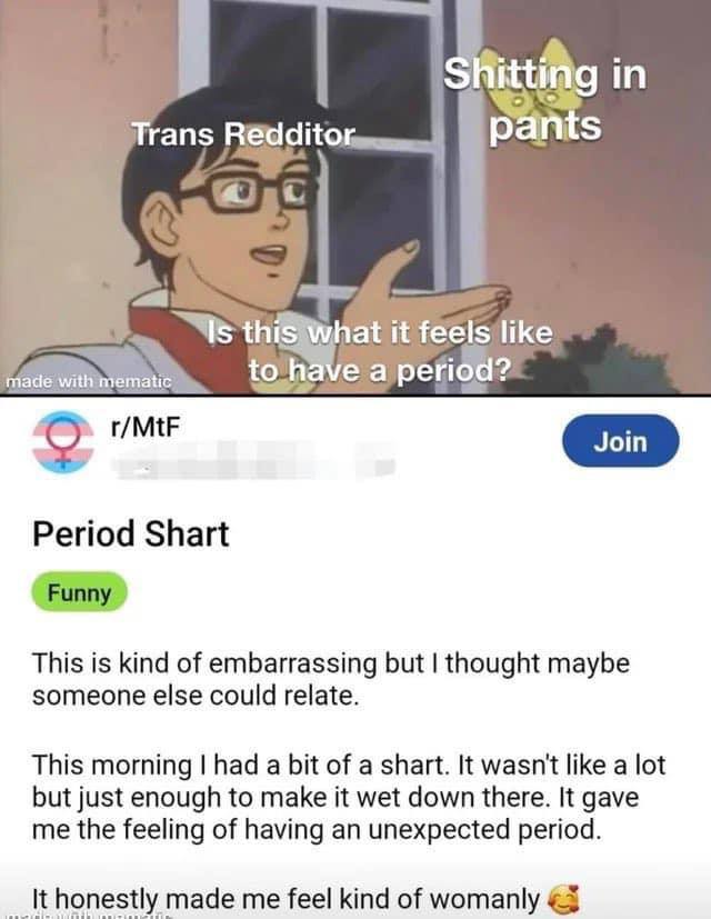 However, your image is of a MTF person, male-to-female do not naturally get periods. They have shown that they might experience symptoms of PMS, but periods remain one of those unobtainable things.