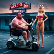 A morbidly obese motel janitor, drenched in sweat and grime, sits slumped on a worn, electric mobility scooter, its chrome handlebars reflecting the dim fluorescent light of the motel's cramped parking lot. The janitor's face is flushed, with red, puffy cheeks and a scruffy beard, his sunken eyes fixed on the plastic, doll-woman standing before him, her bright pink lips curled into a scowl of rejection. She towers over him, her fake, over-inflated breasts and exaggerated hourglass figure a stark contrast to the janitor's frazzled, disheveled appearance. Her skin is a tacky, orange-tinted fake tan, her bleached-blonde hair styled in stiff, curlers-set curls. Behind them, a faded, peeling motel sign creaks in the wind, its neon letters reading "Paradise Inn" in a mocking, crooked smile. The atmosphere is heavy with the scent of stagnation and desperation, the janitor's face a picture of crushed hopes and shattered dreams.