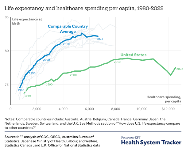 Yikes. A topic as hot as the center of the sun. I came across a document about why life expectancy in the US wasn't as good as other wealthy countries. The document (400 pages if I recall correctly) was written in about 2012. But the most informative graph showed that life expectancy for one particular demographic started diverging from other rich countries about 1955. So it's not a recent phenomenon.