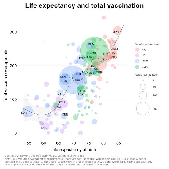 Anonymous G replied with this 1 year ago , 57 minutes later, 6 hours after the original post[^] [v] #1,321,074 Life expectancy vs number of vaccinations for each country, using colour for affluence of each country.