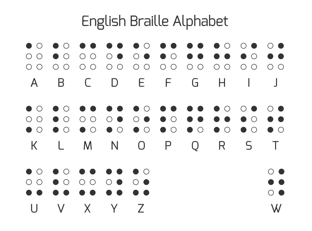 As any resource should point out to you, the first 10 letters A to J have their patterns repeated for the next 10 letters K to T, with the difference that the second set has another dot at the lower left. The five letters U, V, X, Y, and Z have the same pattern as from A to E, but with two dots in the third row. The letter W is the odd one out, because Mr. Braille was French and the French alphabet did not have W. The extended Braille alphabet has several accented letters used in French, and the bonus W at the end of the set.