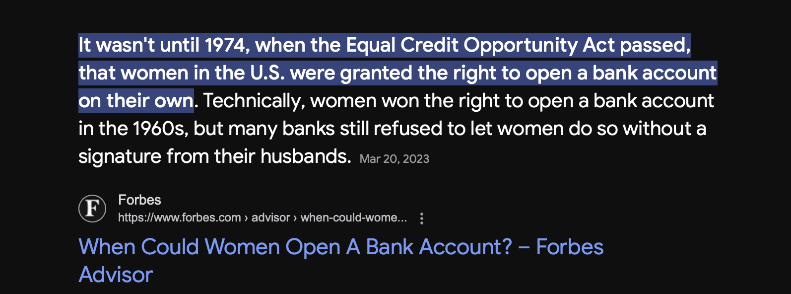 Please show any laws or other evidence that women were prohibited from opening bank accounts. Not just some random gender studies professor claiming it without their own source.