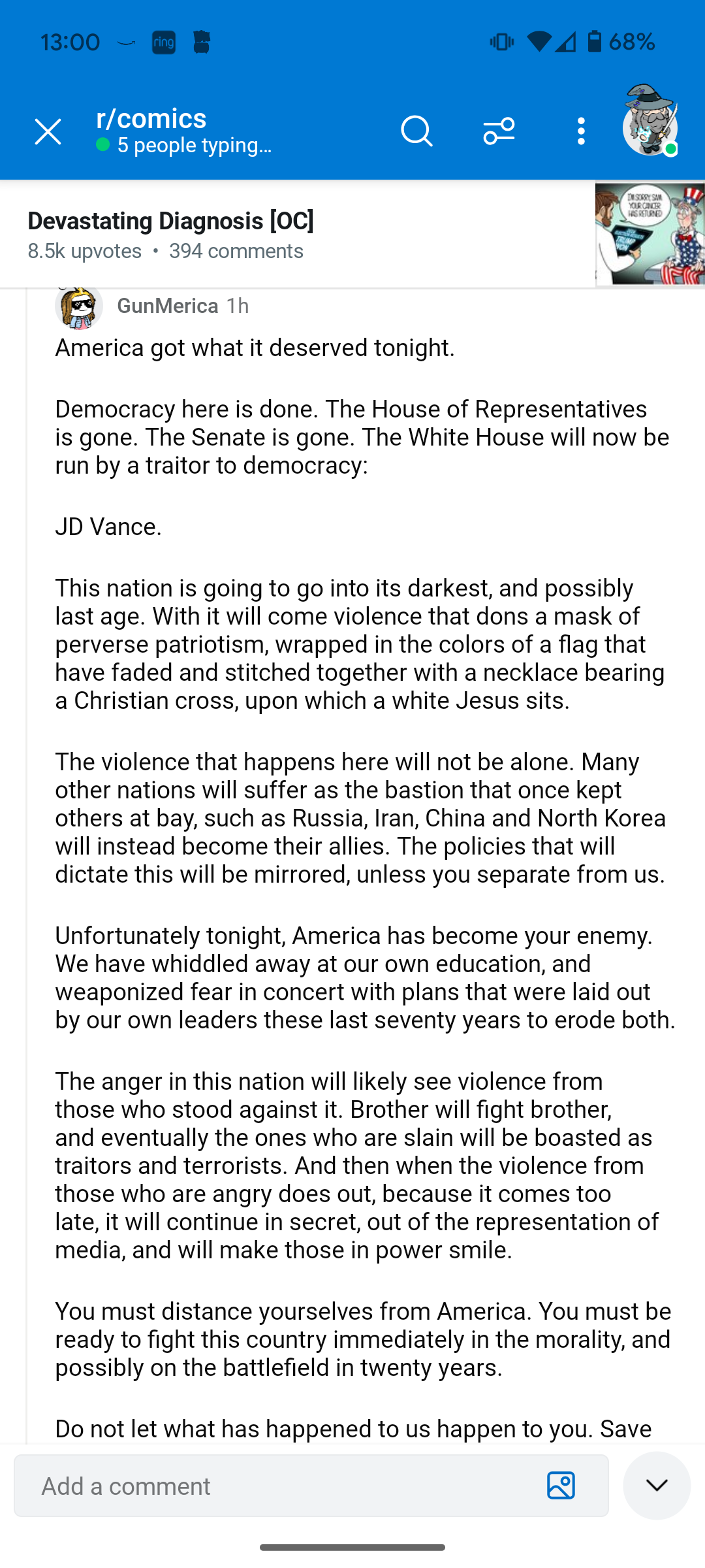 > > This time I'm just numb. I'm not even sad, just sort of mentally calculating how much this is going to cost us. It's not looking good! > > Funny enough I feel kind of the same way from the other side. I don't feel the triumphalism I felt in 2016, nor the sadness of 2020 (though I was expecting a Trump loss due to the COVID/Floyd emotions running high). > > I just hope the media eases up on covering all the dumb shit like Covfefe and holding the Bible upside down, drawing on the hurricane map with a sharpie, etc. All the little inconsequential things.