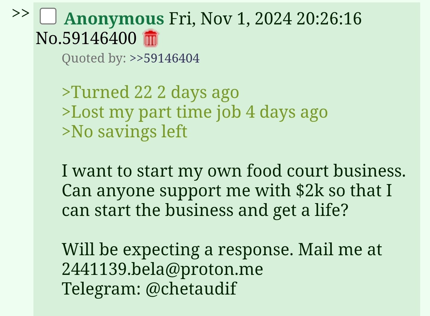 If possible to help me out, email me at [email protected] tteh !MemesToDNA joined in and replied with this 1 year ago , 14 hours later[^] [v] #1,329,526 Food court business, you say?