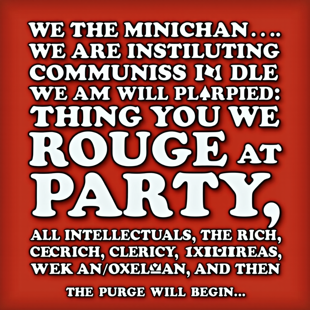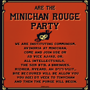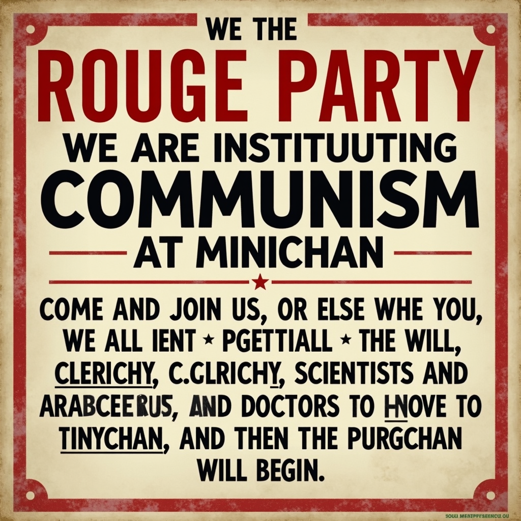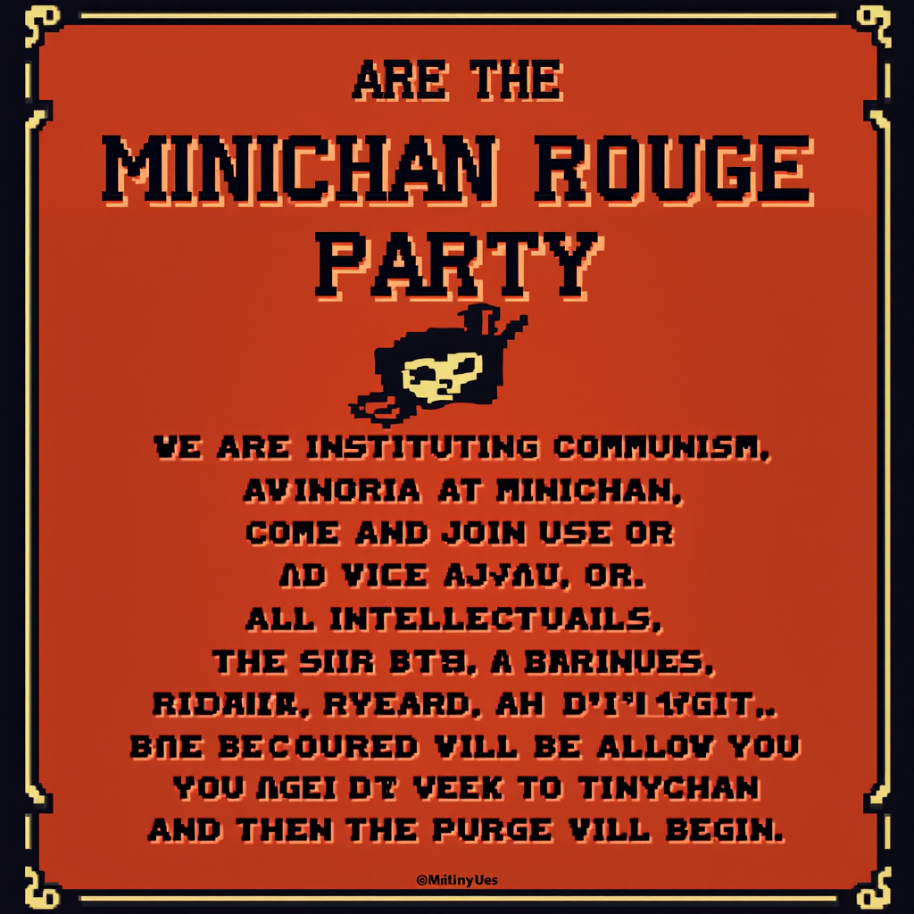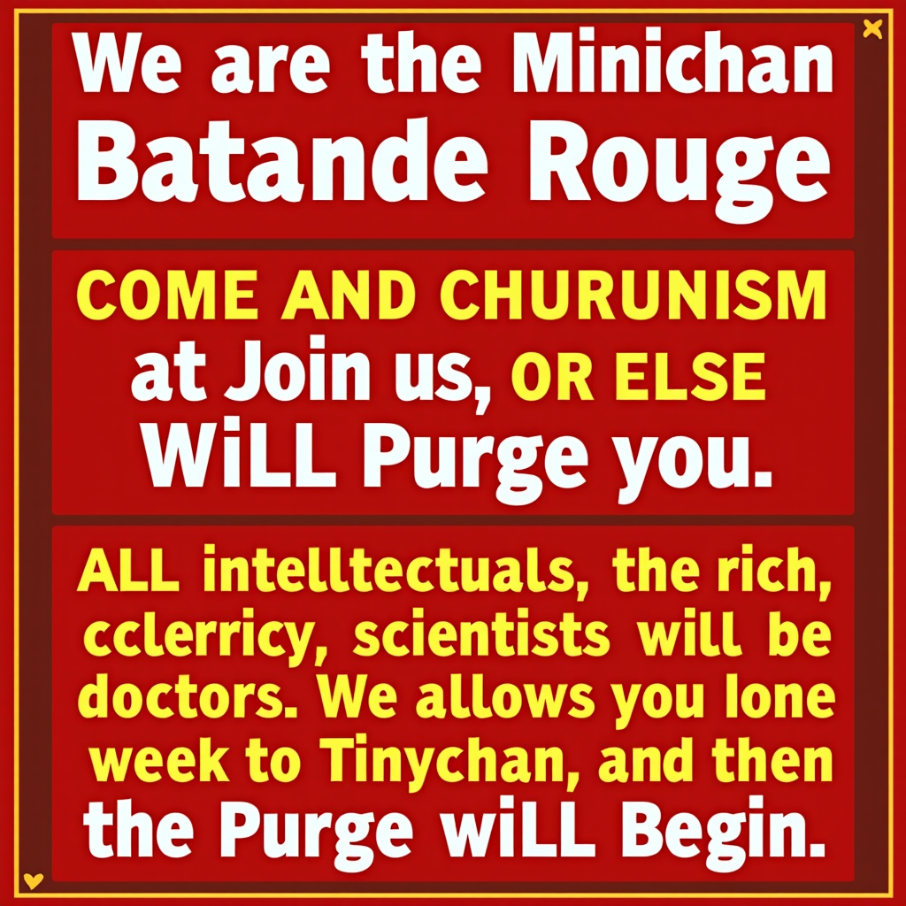 Minichan Rouge Party started this discussion 1 year ago #121,846 We are the Minichan Rouge Party. We are instituting communism at Minichan. Come and join us, or else we will purge you. All intellectuals, the rich, clergy, scientists, and doctors will be purged. We allow you one week to move to Tinychan, and then the purge will begin. (Edited 30 seconds later.)
