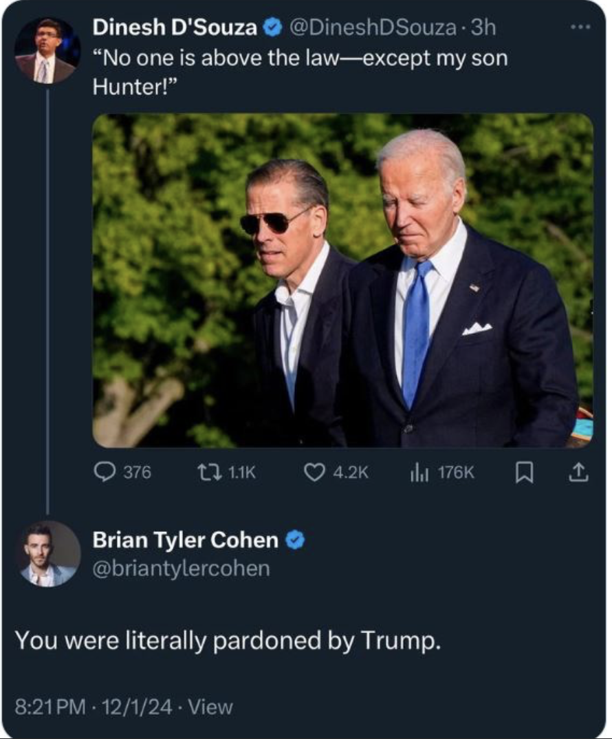 Pointing out Dinesh was pardoned isn't some gotcha, that's the point. The hypocrites wouldn't shut up when it was him. Democraps bitch and whine and piss themselves when Trump does it, and then break their own pledge to do the same.