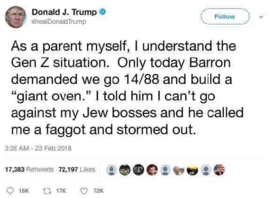 Kook !!rcSrAtaAC joined in and replied with this 1 year ago , 20 minutes later, 52 minutes after the original post[^] [v] #1,342,372 I do believe that Trumps son would call him a faggot