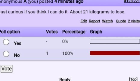 Anonymous B replied with this 1 year ago , 13 minutes later, 9 hours after the original post[^] [v] #1,343,305 Greenself !!bO/s3MBcD replied with this 1 year ago , 6 hours later, 16 hours after the original post[^] [v] #1,343,332 @1,343,231 (Goal weight 1/1/26 !MFujcnRmjo)