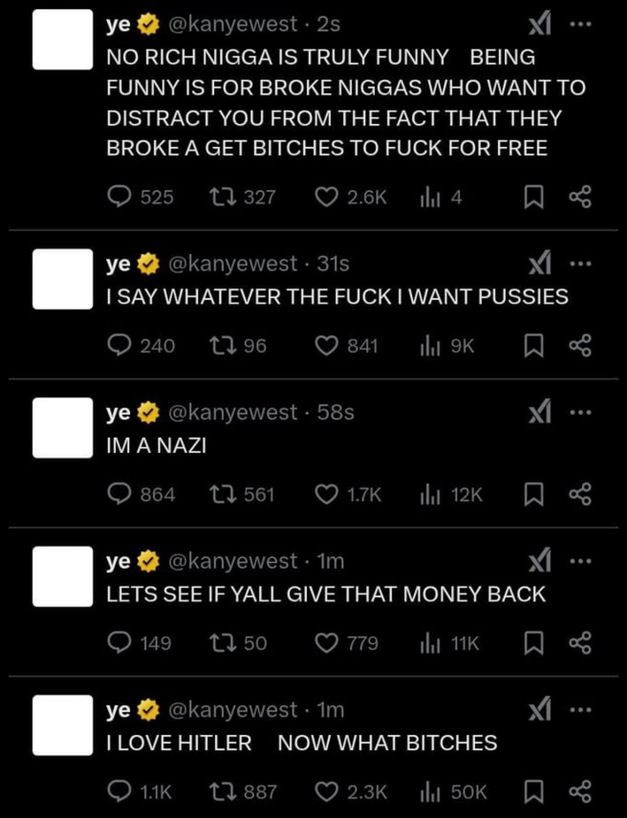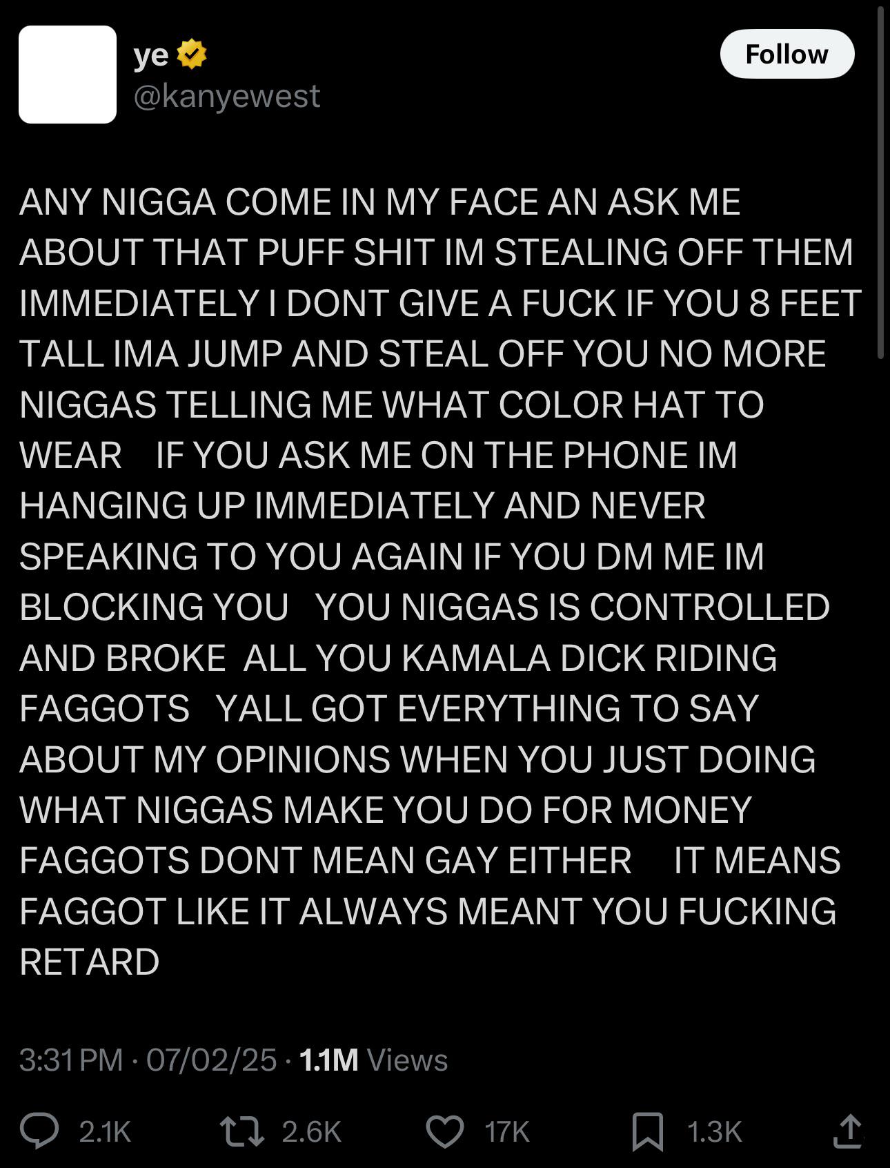 > Is going off once more about the jews in an even more unhinged manner than ever before. Also now wants to free Diddy lol.