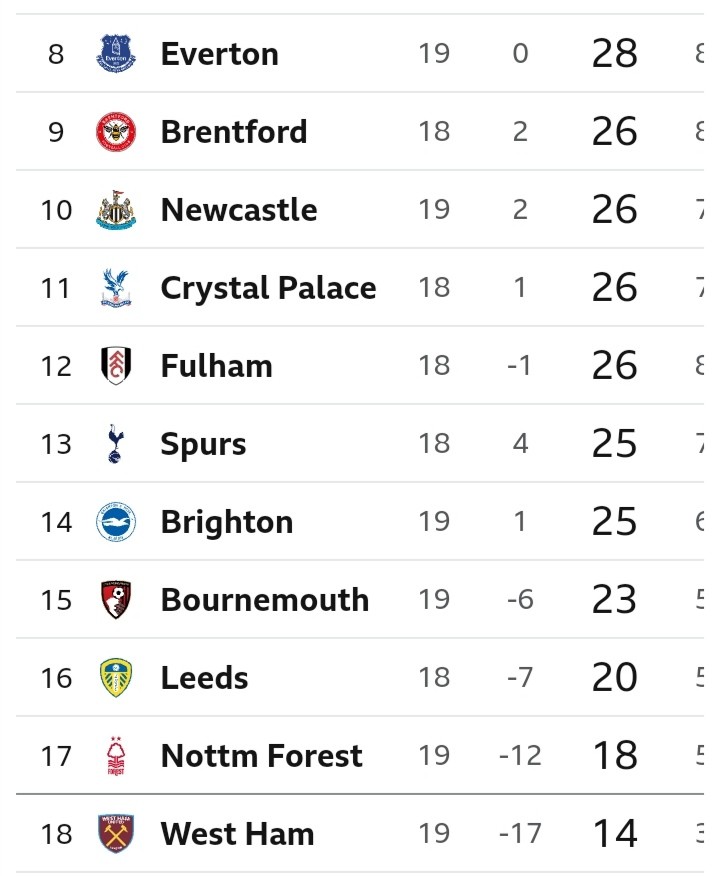 We've reached the midway point in the season. This forum won't let me post the full league table because it says I'm exceeding the file size so I've had to cut this image down to positions 8 to 18.