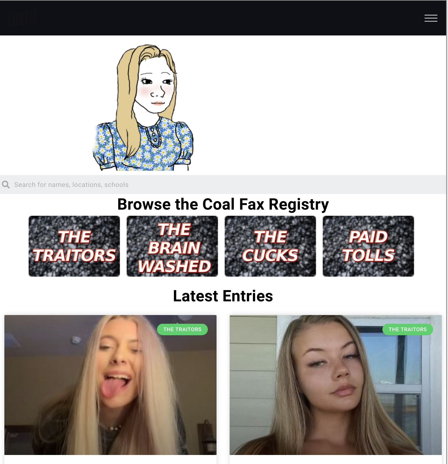 > Coal Fax, referred as The Coalburner Registry, was a white supremacist doxing website that posted personal information of white women who were dating or have dated black people, contributing to "white extinction", probably.