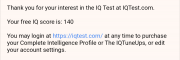 Take the test on IQtest.com, it took me less than 10 minutes. It tries to sell you a fancy one but it gives you the actual number for free, like in the picture.