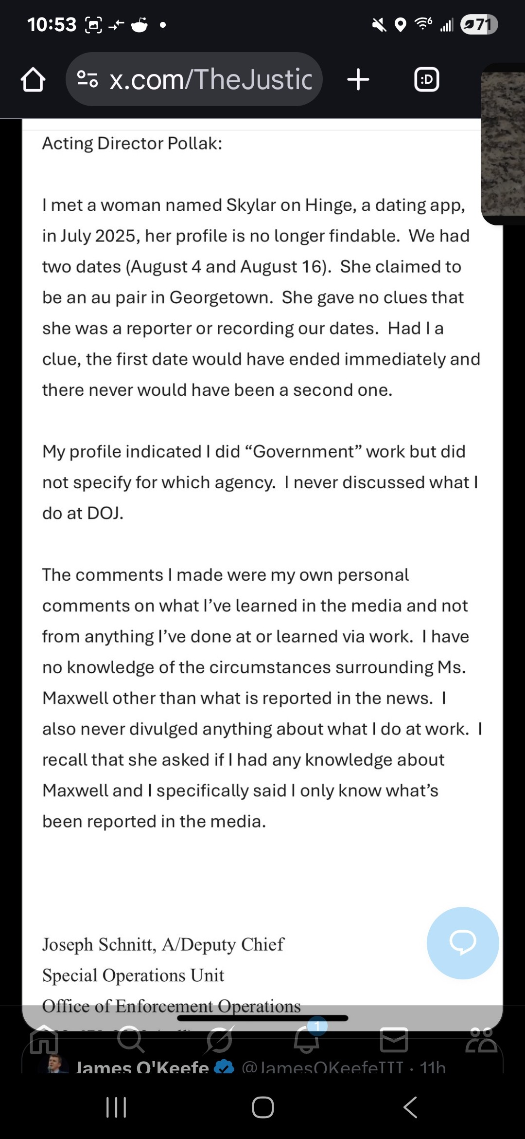 Told date (who was secretly a reporter) that they were going to release the Epstein files with all Republicans removed. Admitted that they moved Ghislaine Maxwell to a low security prison so that she would keep her mouth shut. The whole thing was filmed