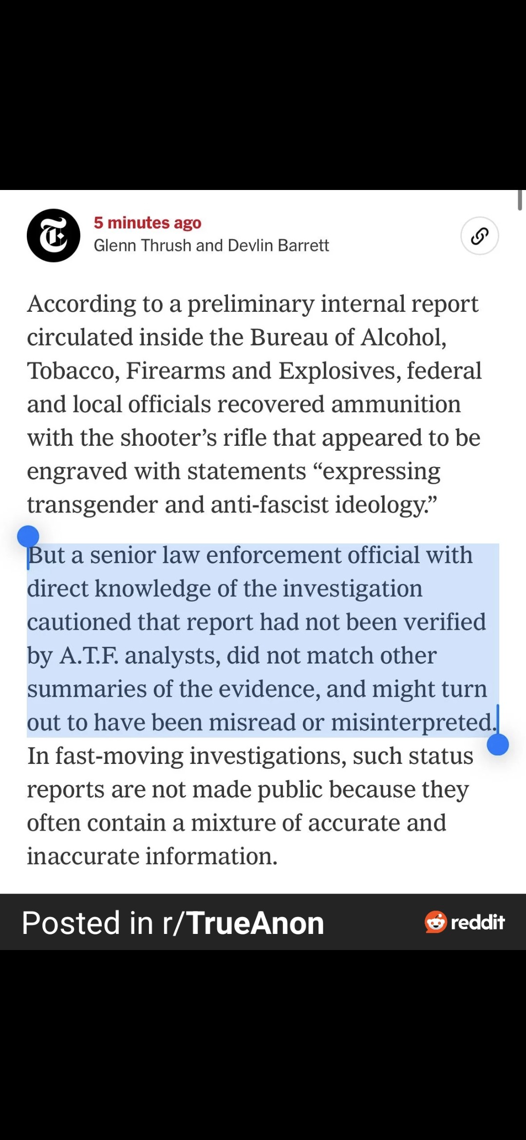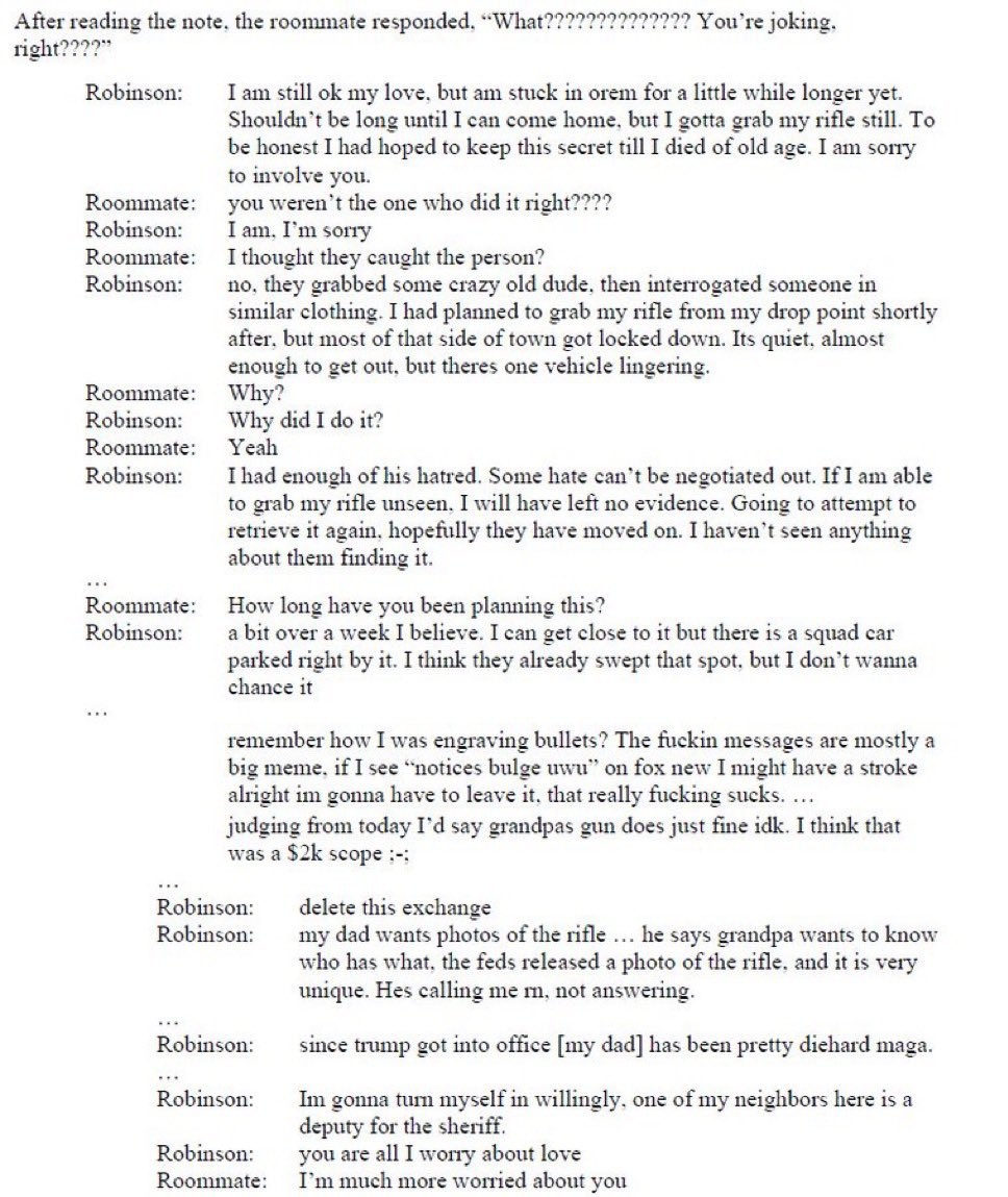 First it was the shooter was a random transwoman, then it was the bullet casings had pro trans messaging, and now it's the shooter's roommate is trans. It's totally possible they're right this time but I think it's wise to slow down on the accusations after tripping over your dick and faceplanting twice.