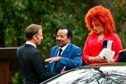 France's President Emmanuel Macron, left, welcomes Cameroon's President Paul Biya and his wife Chantal Biya during a ceremony marking the 80th anniversary of the Allied landings in Provence during World War II, in Boulouris-sur-Mer, France