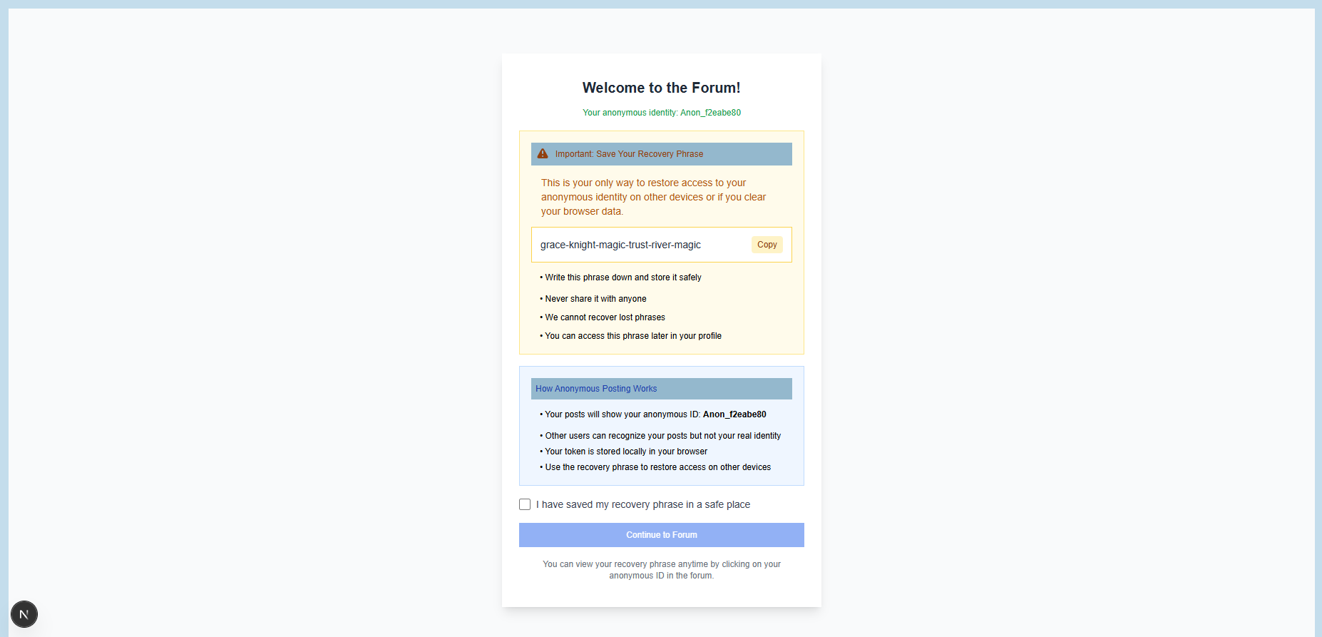 the first choice it made for me was this. you're directly confronted with the unique ID mechanics of the site, it actually generates a restore ID passphrase immediately upon visiting the site, rather than storing your UID and password like ATBBS + co do. i think that's pretty cool.