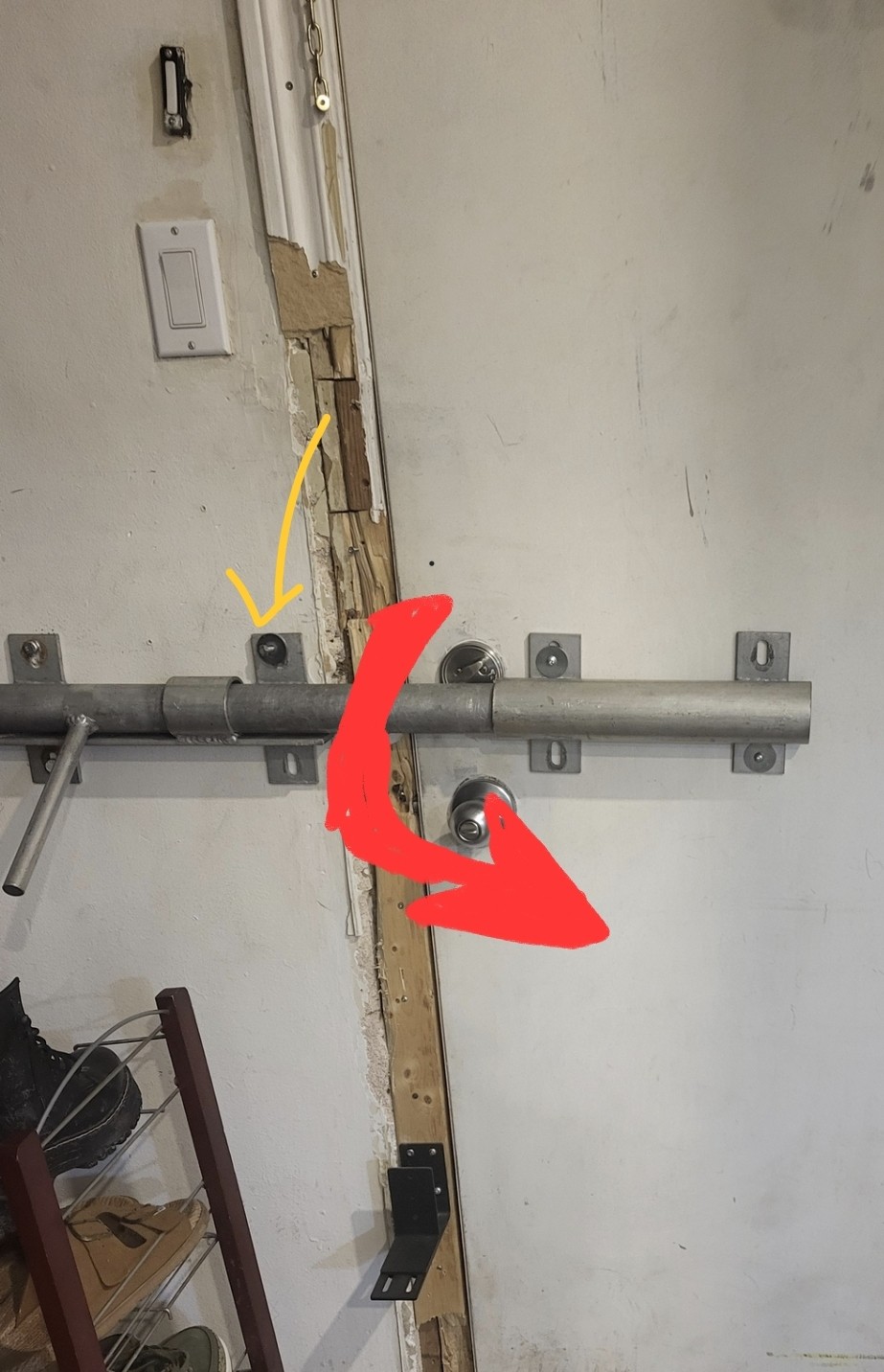 To the doorframe? Someone kicked it in and did a shitty job fixing it. Why the massive bolt? Idk why to be honest. It's a little overkill. I guess there won't be a repeat of the door getting kicked in though!