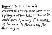 Better but I would recommend getting some bolts and filling in all the bolt holes, as it would spread pressure if someone were to try to force their way in.