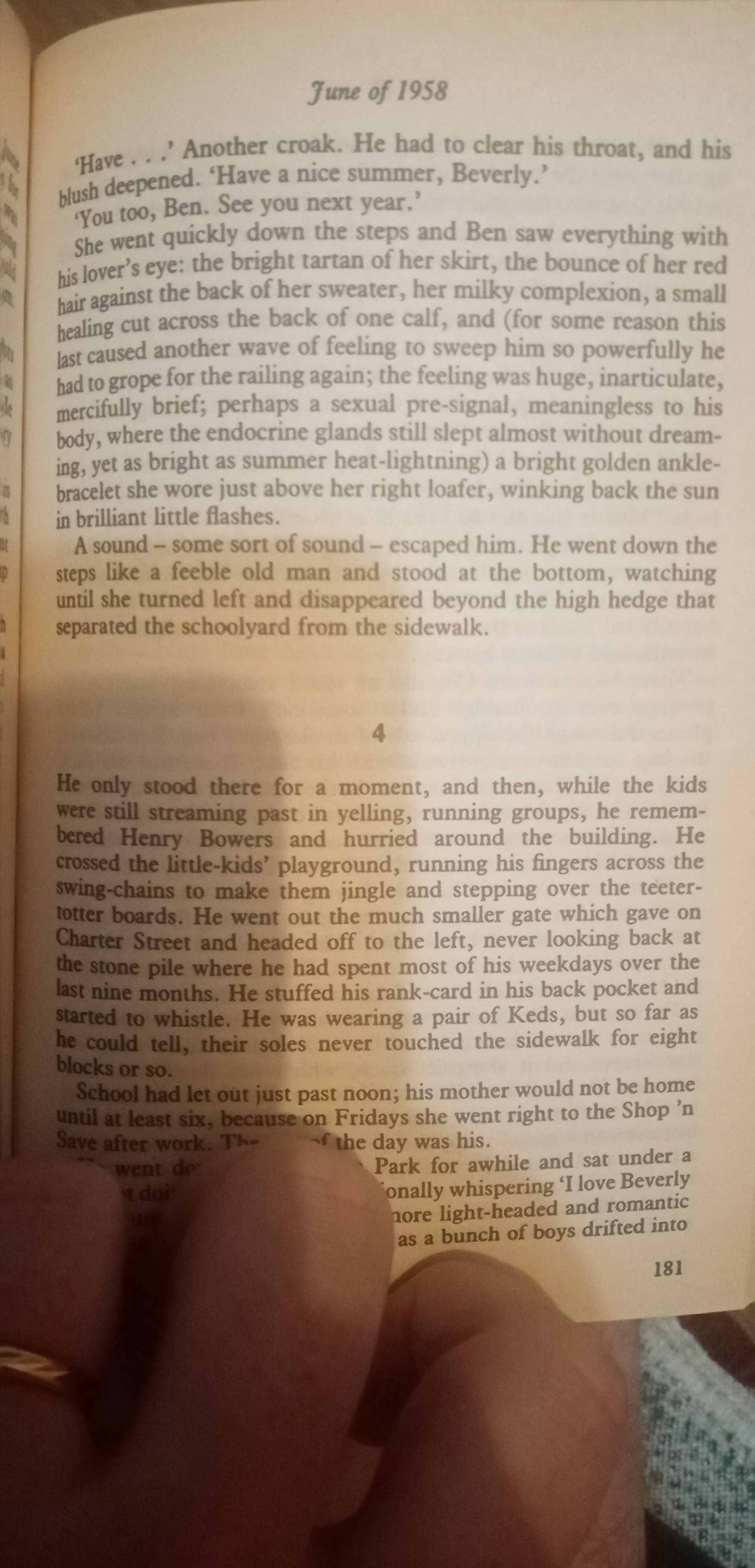 It's funny because I'm re-reading the novel for the first time in literally decades due to the Welcome To Derry series, and today I reached the point where the fat, bullied 11 year old Ben Hanscomb falls hopelessly in love with Beverly Marsh and despairs that a girl like her will never look twice at a boy like him. Weird as it is I kept thinking "A little over a month from now you'll be banging her".