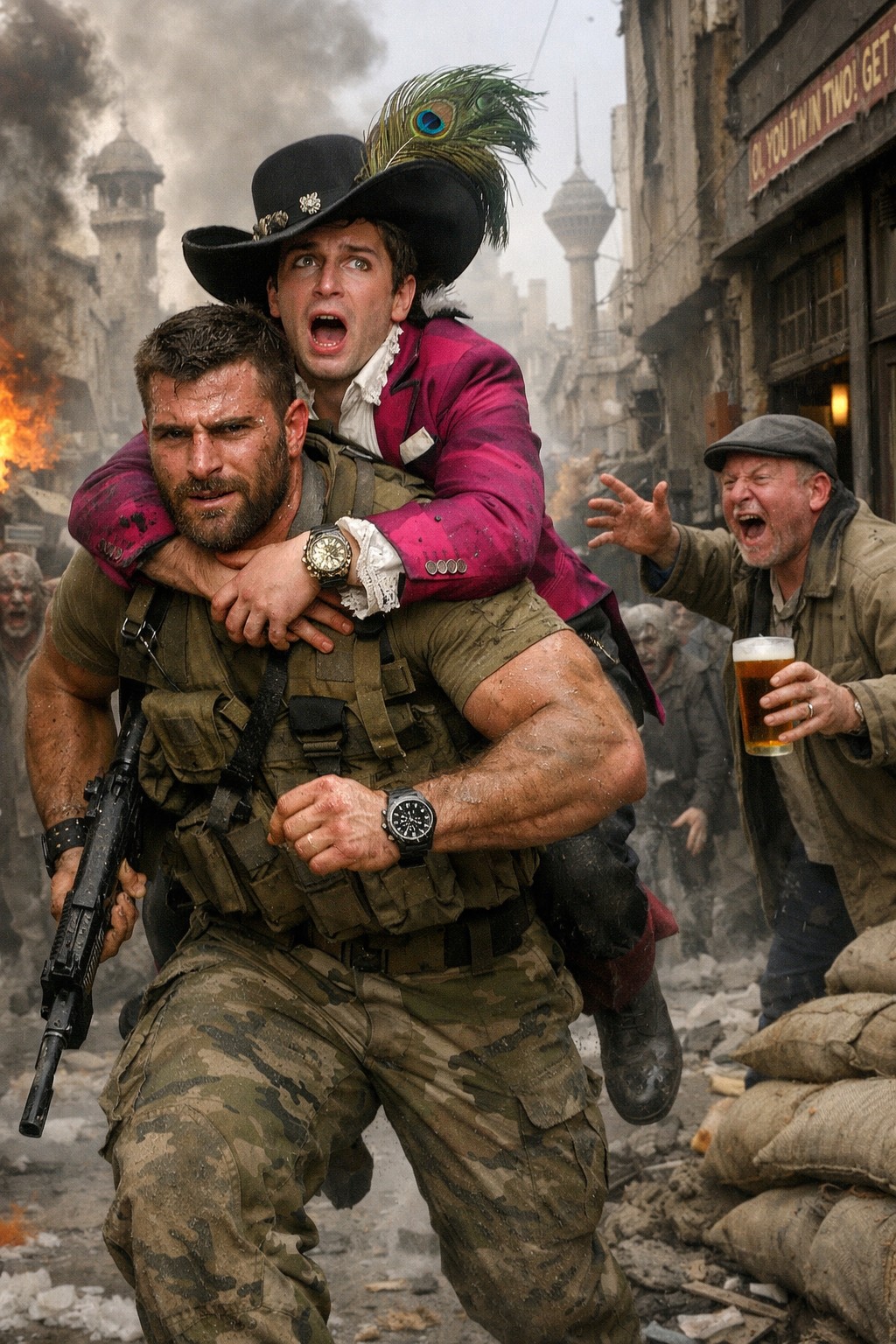Then the US and Israel invaded, setting off a zombie apocalypse! As rugged Hamilton field watch man saves the dandy, Green yells rom a pub on the side of the street. It is a fortified pub, and it is their only chance for safety. They run towards Green and the pub as soldiers and zombies draw close!