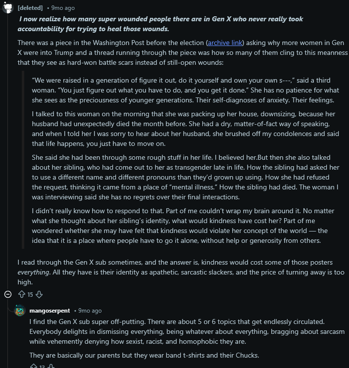 > Poster says 'wounded' as if trying to apply gen Z ideals to the rest of the population. Just because boomers did them dirty doesn't make the gen Z crusade 'just' or 'absolute truth' - it's just the current hotness.