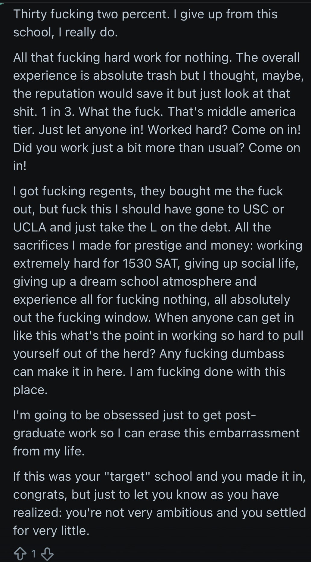 So if they’re shocked by one in three that’s kinda weird. Because if you do the math on it they had a 93% chance of getting into at least one, but the highest acceptance rate is a little less than a 1 in 3 chance, so it sorta makes sense they only got into 1 out of 3 because what else was going to happen with those odds?