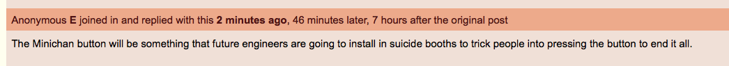 Anonymous E joined in and replied with this 8 years ago , 1 hour later, 8 hours after the original post[^] [v] #898,767 @OP