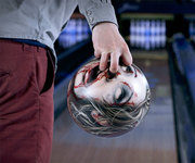 An adult human head is usually slightly larger than a standard bowling ball. You would either have to make a larger than standard bowling ball or use a smaller head. (Maybe a shrunken head?) You can get clear resin to cast it in for pretty cheap. It would look pretty creepy, but you might have some issues with weight and center of gravity that you would have to address if you actually wanted to bowl with it.