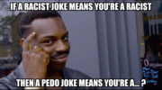 Racist jokes generally involve being ironically racist, so equivalently, only if the pedo joke were a practical joke, would it make you a pedo -- and even then, only ironically.
