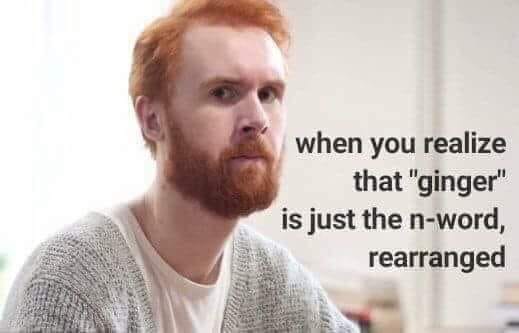 We should make it a thing that "ginger" can only be used by Celtic people and they're all like "wassup my ginga" to each other but if a non-Celt says "ginger" or "ginga" (they're considered different words somehow) they get shamed out of their job and become a pariah.